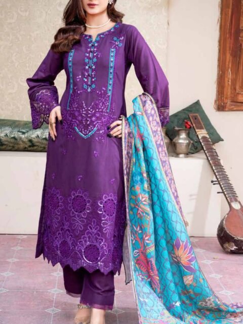 Simplicity redefined, this deep purple ensemble speaks volumes through its beauty. The shirt is gorgeously adorned with two-toned light gold zari and gleaming light gold sequins, creating a soft, celestial shimmer across the fabric. Matching threadwork in harmonious hue adds depth without overpowering the graceful minimalism. Paired with a beautifully embroidered dupatta that mirrors the refined charm of the ensemble, this look is a masterclass in understated sophistication—perfect for moments where less truly feels like more.
